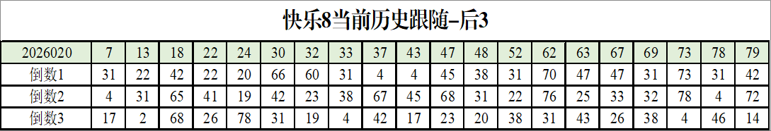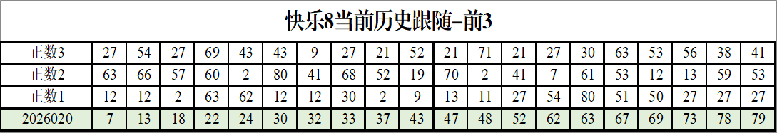 我感觉选热的同时,还要注意防冷条件开出,可以直接选取每个号码跟随出次前三的号码,也可以考虑把出次最后的三个数字加进去,不过这样可能号码太多,可以尝试。图上也能看出单独号码跟随的情况,我就不一一统计每个号码的出次了,我这里考虑提高概率,取每个号码历史跟随的前三号码和后三号码,根据2026020期的号码,我关注正数3和倒数3的号码号码为: