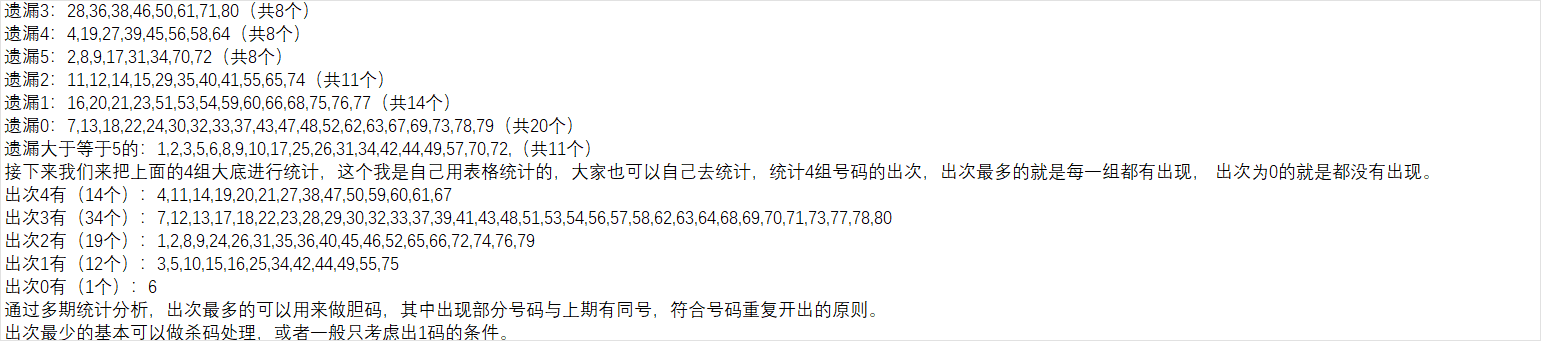 如果把对数和补数合起来有40个号码,中间可能还会产生一下重复数,通过近几期的统计分析,以上期数据进行补数对数计算推算下一期的概率不高。为提高概率,我主要是用前两期的数据来进行对数补数推算,然后再组成一个集合,作为我的第四组大底号码。