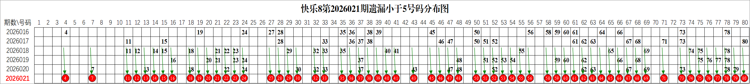 所以这个条件值得关注,从号码分布图上我们可以分析出,遗漏小于5期的号码有: