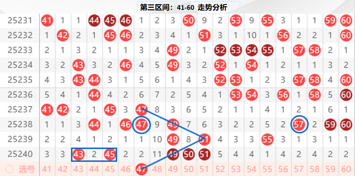 三区分析:【41-60】(走势图标注号码非小黄车大底,请谨慎参考,具体思路将在直播间分享讨论)