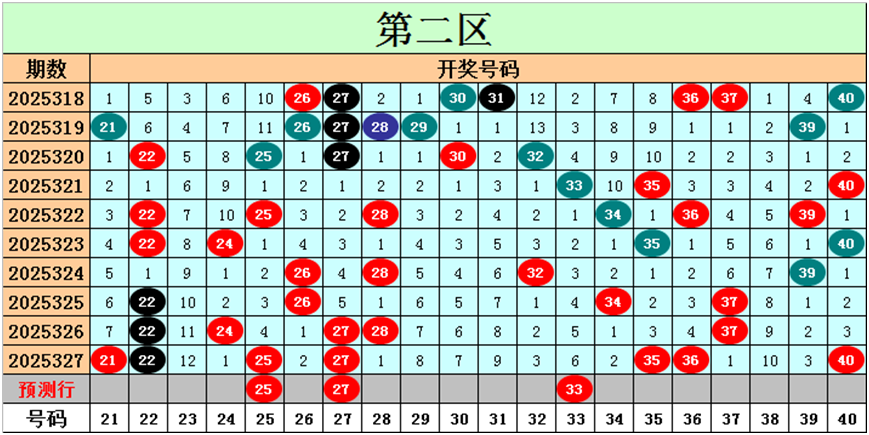 目前第二区包含12个热码:重码7个21、22、25、27、35、36、40,邻码5个24、26、28、34、37,孤码0个;包含3个温码:邻码1个39,孤码2个32、33;包含5个冷码:邻码1个23,孤码4个29、30、31、38;号码冷温热个数比为5:3:12,重号、邻码、孤码个数比为7:7:6。