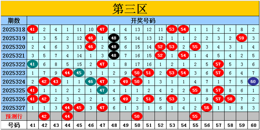 目前第三区包含12个热码:重码4个44、45、47、56,邻码3个41、55、57,孤码5个42、49、51、53、58;包含7个温码:邻码3个43、46、48,孤码4个50、52、54、60;包含1个冷码:邻码0个,孤码1个59;号码冷温热个数比为1:7:12,重号、邻码、孤码个数比为4:6:10。