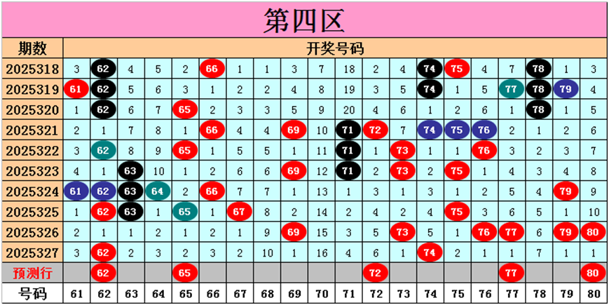 目前第四区包含12个热码:重码2个62、74,邻码3个63、73、75,孤码7个65、67、69、76、77、79、80;包含5个温码:邻码1个61,孤码4个64、66、71、72;包含3个冷码:邻码0个,孤码3个68、70、78;号码冷温热个数比为3:5:12,重号、邻码、孤码个数比为2:4:14。