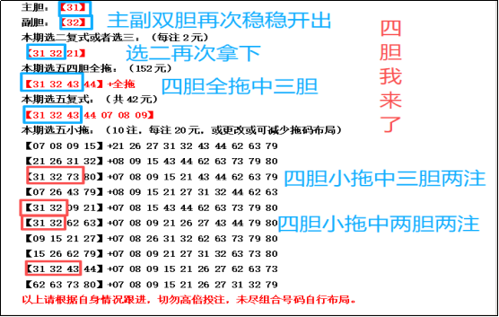 上一期是改版后的第三期,大家自行查看以下附图业绩,主副双胆再次稳稳开出。遗憾的是专属和小车全部中出三胆,四胆全拖又是差一码,好在这一次专属的选三还是稳稳拿捏。本期是春节前最后四天,我们依然是信心十足的组合,力争在本期早日圆梦,完成节前的四胆目标。