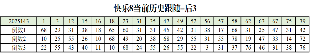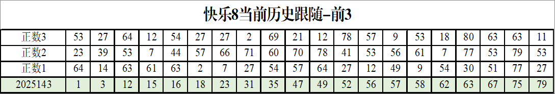 我感觉选热的同时,还要注意防冷条件开出,可以直接选取每个号码跟随出次前三的号码,也可以考虑把出次最后的三个数字加进去,不过这样可能号码太多,可以尝试。图上也能看出单独号码跟随的情况,我就不一一统计每个号码的出次了,我这里考虑提高概率,取每个号码历史跟随的前三号码和后三号码,根据2025143期的号码,我关注正数3和倒数3的号码号码为: