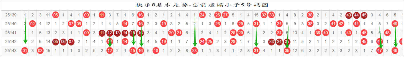 所以这个条件值得关注,从号码分布图上我们可以分析出,遗漏小于5期的号码有: