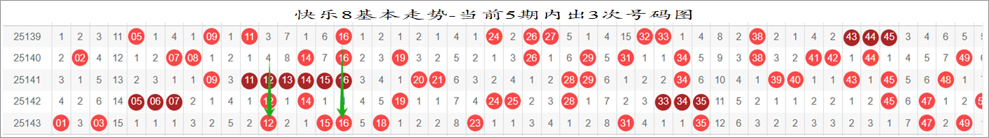 这个条件可以理解为追热号,主要是选取遗漏小于5期的号码来做大底,通过号码分布图我们也能看出,每期都有重复号,都有上期号码的相邻号,再仔细观察下面的部分分布图,2025143期,按照【号码(遗漏)】的方式统计出来是:1(4),3(6),12(0),15(1),16(1),18(5),23(4),........。可以看出遗漏小于5的号码比较常见,这就是一个大概率事件,我们就可以用这个梳理出一部分号码,用来作为我们交集的一组号码。