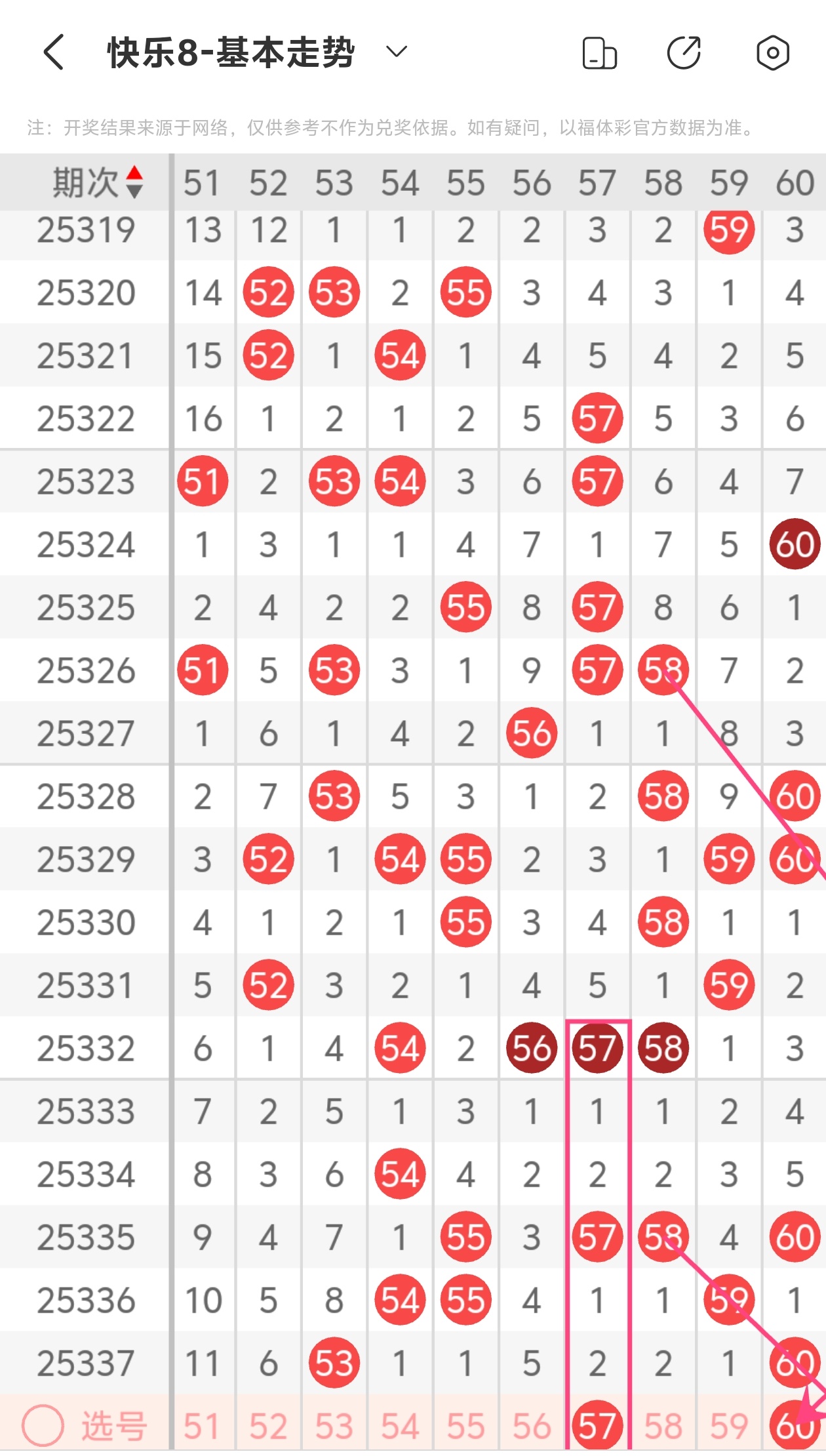上期第六区间开出53 60,587为对称形态,60为斜连走势,本期推荐57 60