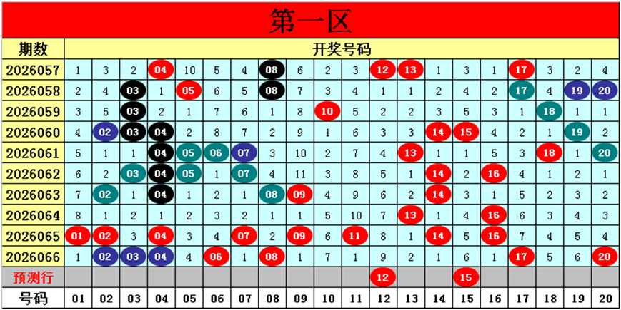 第一区【01-20】分析:上期该区明显较热出现了7个奖号:02、03、04、06、08、17、20,奖号冷温热比为1:3:3,重码出现2个,邻码出现4个,孤码出现1个。
