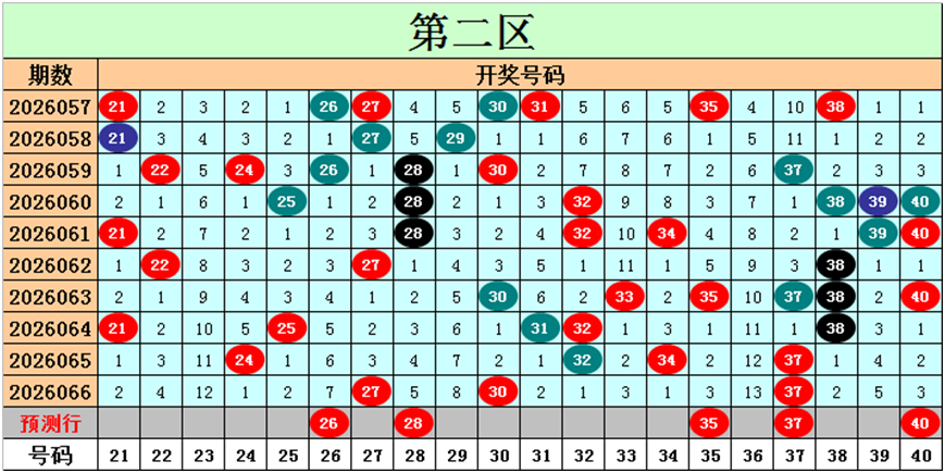 目前第二区包含10个热码:重码3个27、30、37,邻码3个21、31、38,孤码4个24、25、32、34;包含6个温码:邻码2个28、40,孤码4个22、33、35、39;包含4个冷码:邻码3个26、29、36,孤码1个23;号码冷温热个数比为4:6:10,重号、邻码、孤码个数比为3:8:9。