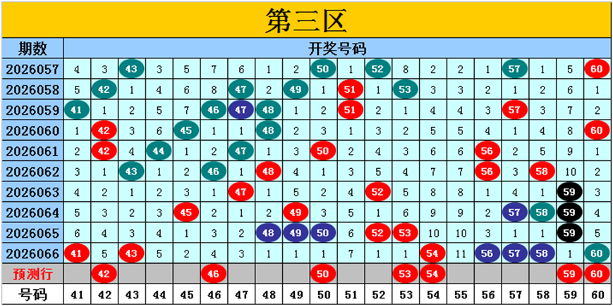 目前第三区包含14个热码:重码7个41、43、54、56、57、58、60,邻码2个53、59,孤码5个45、48、49、50、52;包含4个温码:邻码2个42、44,孤码2个46、47;包含2个冷码:邻码1个55,孤码1个51;号码冷温热个数比为2:4:14,重号、邻码、孤码个数比为7:5:8。
