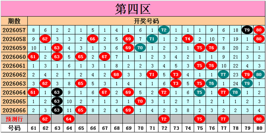目前第四区包含10个热码:重码3个63、65、69,邻码2个61、70,孤码5个67、72、75、77、78;包含7个温码:邻码2个62、68,孤码5个71、73、76、79、80;包含3个冷码:邻码2个64、66,孤码1个74;号码冷温热个数比为3:7:10,重号、邻码、孤码个数比为3:6:11。