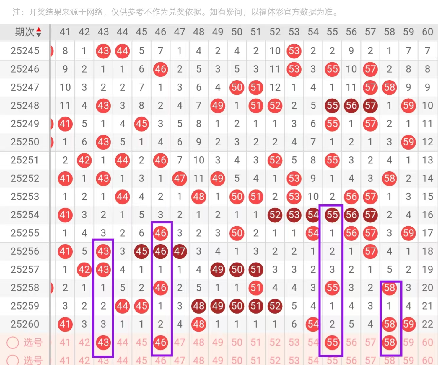 三区41-60:三区间,近几期一直持续走热,近期号码一直再回补空缺位置和分边情况,今天我们首先要关注的是中部区域号码的下落点和大连下面的一个空一回补,在4子头,首先我们要关注的是对子空3的一个选择和今天46-47-2下一或同下的可能,回到五字头,今天我们要重点关注。53-56-2下一和重码的一个选择在尾部我们要防一个58-60同下的可能性。