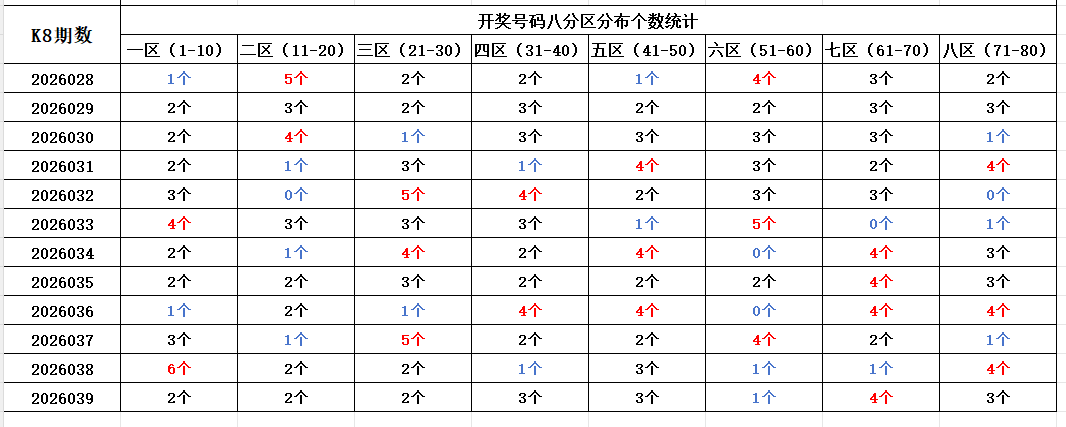 首先看上期回顾,“快乐8”第26039期开奖结果:3.5.13.17.22.27.36.38.40.43.49.50.51.61.62.64.68.73.78.80;通过分析开奖号码,分享第一个数据分析:统计开奖号码的八分区冷热走势,判断出号规律。以近10期开奖号码的八分区统计数据为例: