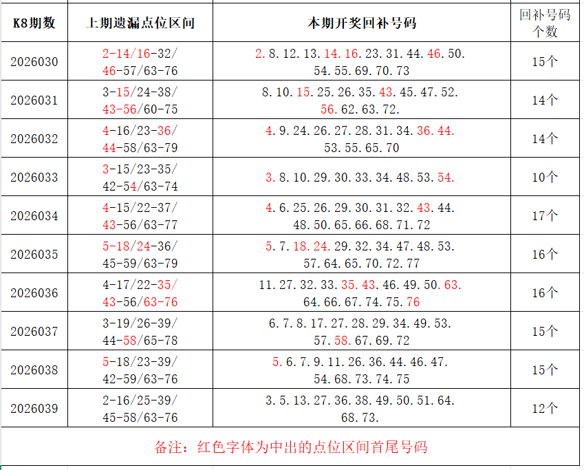 如图,上期的遗漏号码在下期开出10个左右,即为回补号码。定准点位区间首尾号码是关键!以上期2026039期为例,定位4个遗漏区间,围中12码!结合上期开奖号码,以跨度值大于或等于7为依据,本期关注3个遗漏区间:5-13/27-36/51-61;重点关注遗漏区间:4-16/23-39/42-53/63-79。点位区间号码和大底号码请勿混淆,个人分析,仅供参考。