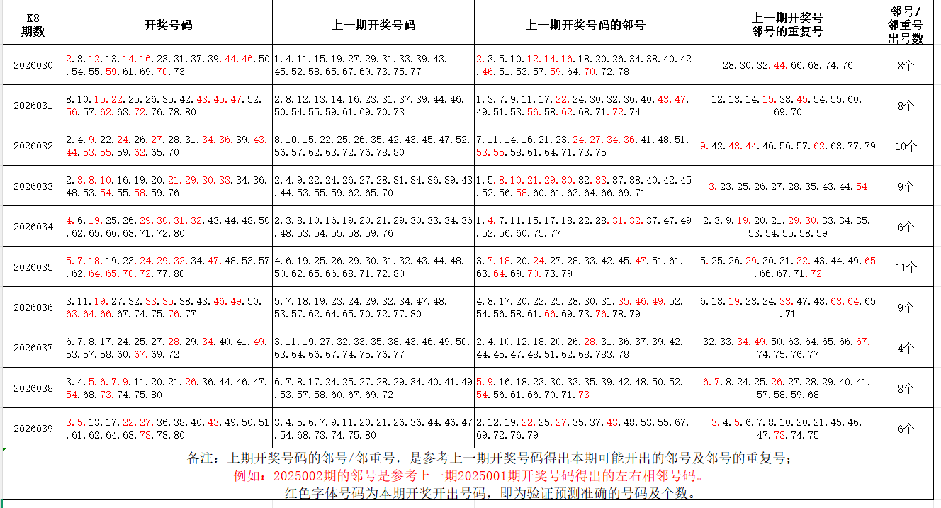 如图,红色字体是上期邻号、邻重号在下期开出,每期开出10个左右。上期邻号开出3个,邻重号开出3个。本期参考邻号:2.6.12.14.16.18.21.23.26.28.35.41.42.44.48.52.60.65.67.69.72.74.77;邻重号:4.37.39.49.50.51.61.62.63.79;个人分析,仅供参考。