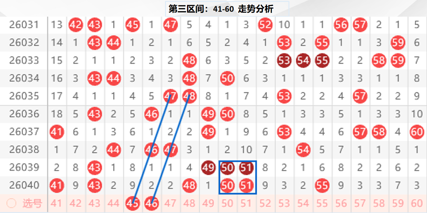 三区分析:【41-60】(走势图标注号码非小黄车大底,请谨慎参考,具体思路将在直播间分享讨论)