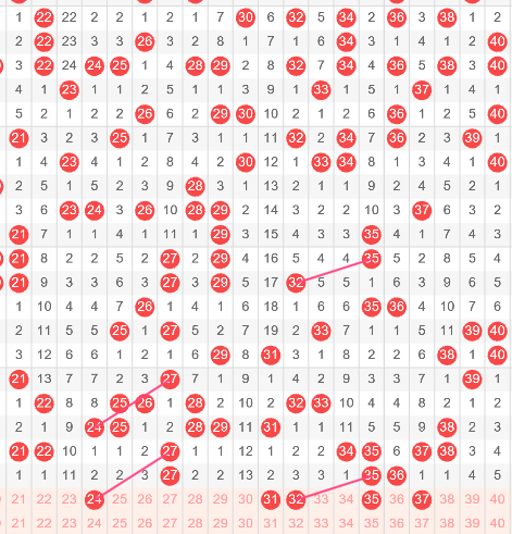 第二区间首先看一码24的 回补有机会,再看31 32二选一做一码有机会 下落,然后 防守 35的重码,做一手37的回补下落有机会,该区间可推荐的选二搭配组合有21 31或32 37,第二区间胆码主看24 31 32 37