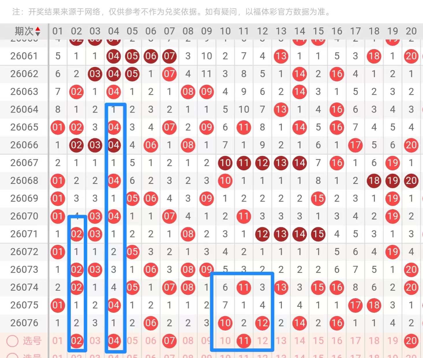 一区1—20:上期一区又出现了回暖的现象,整体给到了五码,在大跨之间也补得偶数的连号,那么近期无论是奇数还是偶数的连号,下一期的底下做号其实是不太多的,所以说本期对于1字头的出发点,个人在分边位置上只能考虑11,然后还有一个更明显的特征,就是0字头06以前没有号码,正常来说1~2码即可,个人看好02 04的龙头回补,值得大家去防守的点,就是说本期432遗漏走势的除了07就是72,这两码选取一码还是可以的,