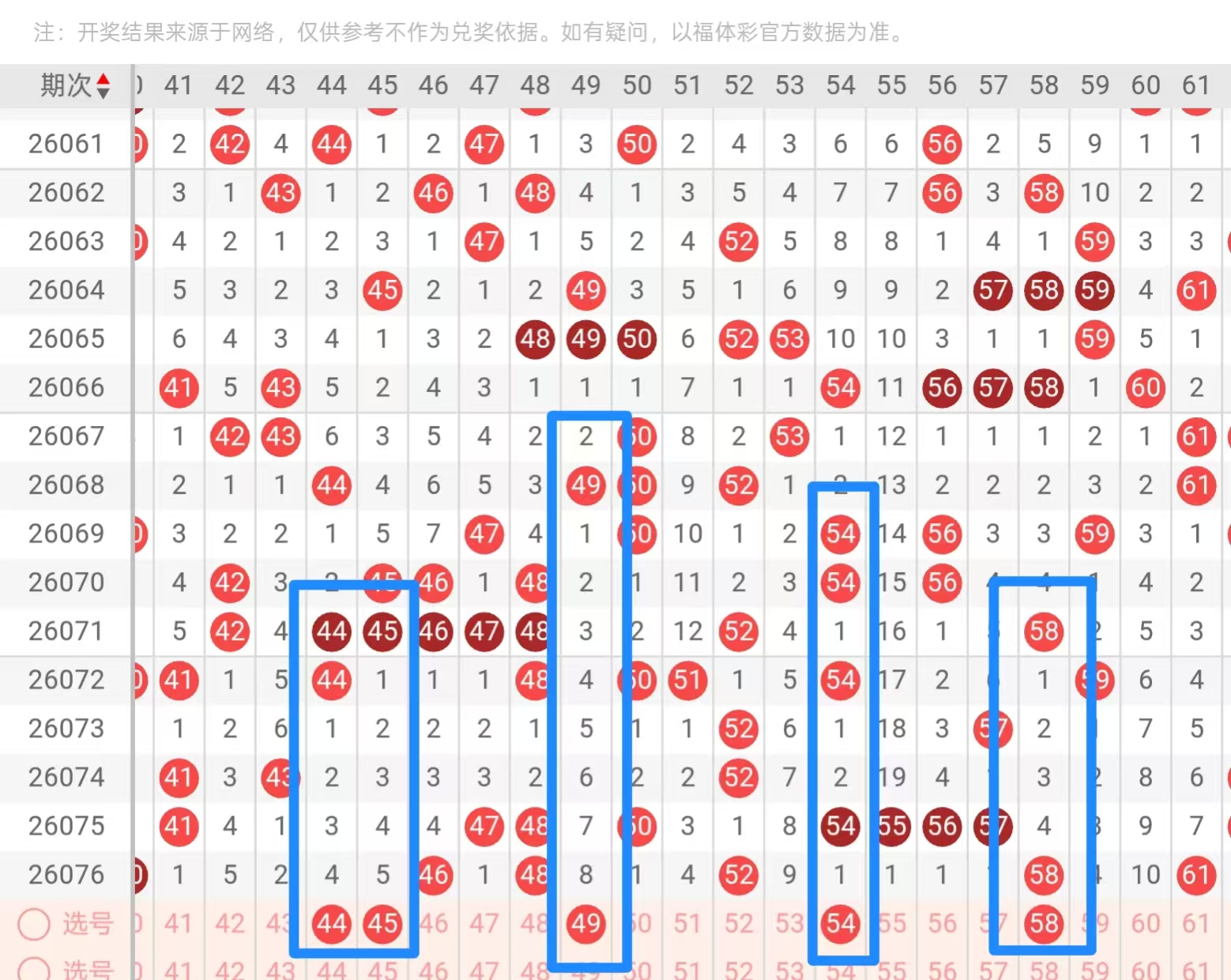 三区41—60:上期的4字头开出了40 46 5跨现在的出号点比较少,所以说两码题可以涵盖,然后这里的点位比较明显的还是本期作为47的明显标志,梅花的形态,那么正常我们是不应该去主做的,考虑三斜连有一边45 49的形态落位可能会更舒服一点,然后5字头又是一个菱形下来的,菱形这种情况的做号点尽量以类分边为主,那么50 52 54干净的偶数连号也是可以去打第三期的形态走势,想打组合的话,49 54,49,58都是非常不错的选号点