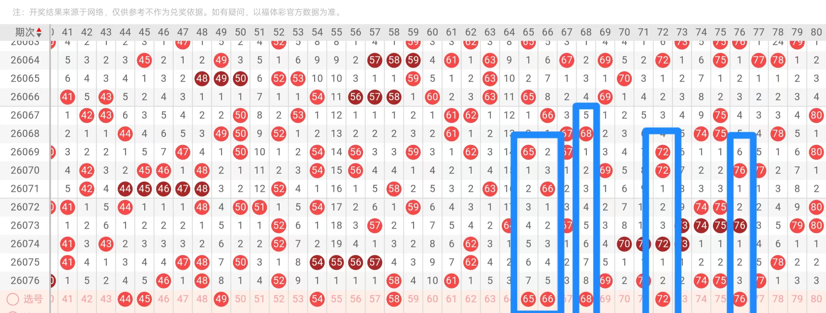 四区61-80:四区6字头开出了一个7跨,那么正常来说上一次给到类似的情况,当时补的是中间的64 65,但是本期64作为大一度的短期回补可以不用去看,那么63 66考虑一码,个人觉得还是66比较好,所以这里可以打一个对子带间隔的回补65 66带68,后期的形态当中尽可能的做分边,近期四区的重码没有太好的体现,那么我们正常再考虑一期以分边形态为主的落位走势。