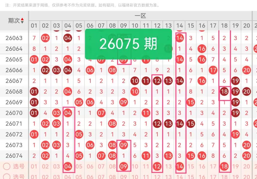 上期第一区间开奖9个号码,本期可能会减少开出。04:近30期开出频次处于中等偏冷区间,上期未出,具备回补基础,且与上期热号02、05形成间隔分布,避免号码扎堆;09:近期走势平稳,上期未出,与热号07、08、11形成邻号关联,兼具热度与冷度平衡;12:历史开奖中属于中频号码,近10期热度适中,无连续热出记录,适合作为一区均衡补充;14:近30期开出12次,属温号,上期未出,与一区热号13、15形成间隔,提升区间分布合理性;18:近5期热度较低,上期未出,填补一区后半段空缺,与前段号码形成跨度,增强整体稳定性。