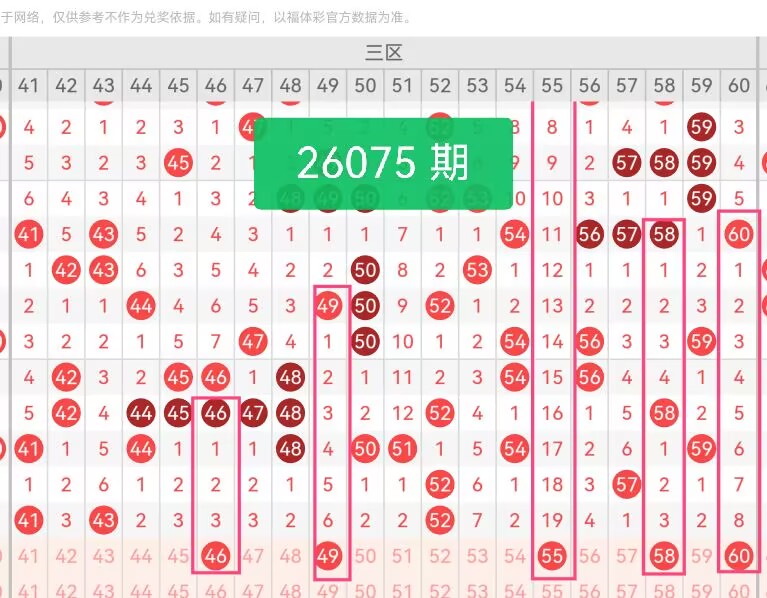 上期第三区间开奖个3号码,本期可能会增加开出。46:近30期开出频次中等,属温号,上期未出,填补三区中段空缺,与上期热号41、43形成间隔,优化区间分布;49:近期走势平稳,近6期未出,属冷号但无极端冷态,适合作为三区补充;55:近10期热度适中,无连续热出,属中频号码,上期未出,填补三区后半段空白;58:历史开奖中属于稳定号码,近30期开出7次,属温号,上期未出,与55形成区间内均衡分布;60:近5期热度较低,上期未出,靠近三区边界,与热号52形成间隔,增强三区覆盖完整性。