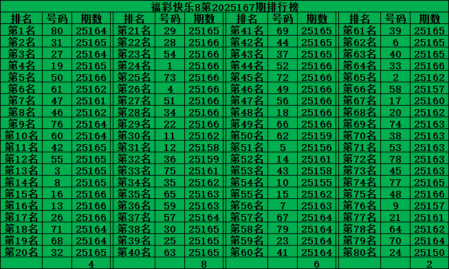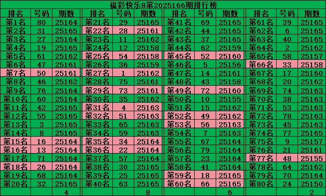 最后再把号码分为五区:一区01-16号、二区17-32号、三区33-48号、四区49-64号、五区65-80号,理论上每个区每期应该开出4个号码,2025165期五区比例:4:4:3:6:3