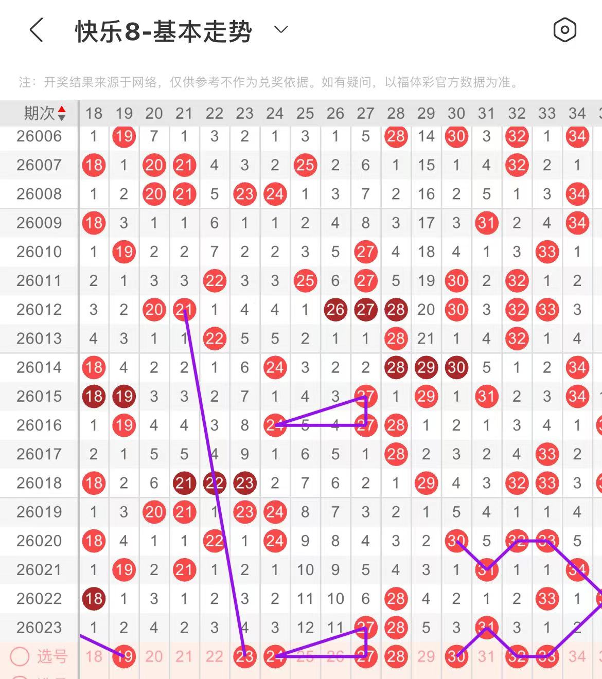 21-30区:本区间上期开出了两个号码,从号码走势图上看,该区出号个数有突增的可能,前半区连续走空两期,本期注意号码回补,后半区关注重号开出,出号个数在三个号码左右,有出号走势的的号码有23号,斜连出号走势,防23.24或者21.23同出,28号,走三重复制上面走势形态出号,防28.30同出。
