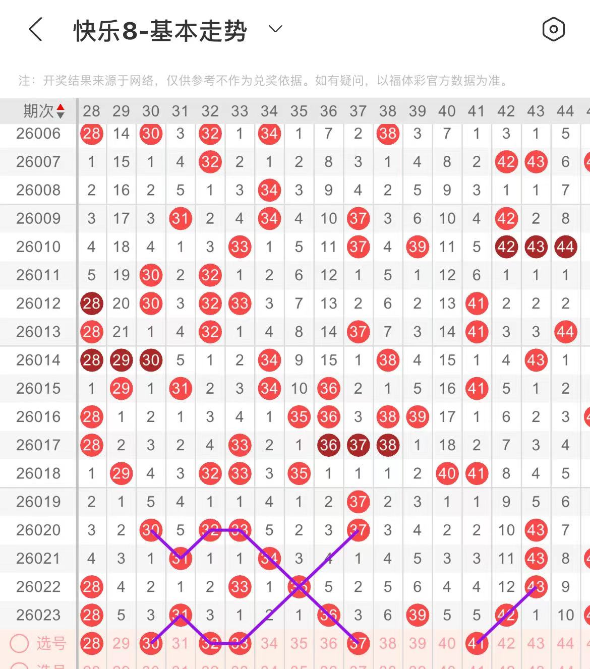 31-40区:本区间上期开出了三个号码,从号码走势图上看,该区出号个数有一定的规律性,出现逐级递增走势,本期注意出号个数增加至三个或以上,在选号上可考虑多做选择。有出号走势的号码有33号,斜连出号走势,防32.33出,37号,斜五连出号走势,防37.38同出的可能。