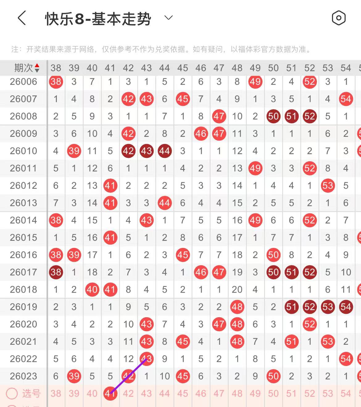 41-50区:本区间上期开出了三个号码,从号码走势图上看,该区现属于冷号区,出号个数不稳定,在选号上建议以防为主,出号个数在一两个号码左右 ,有出号走势的的号码有41号,斜连出号走势。