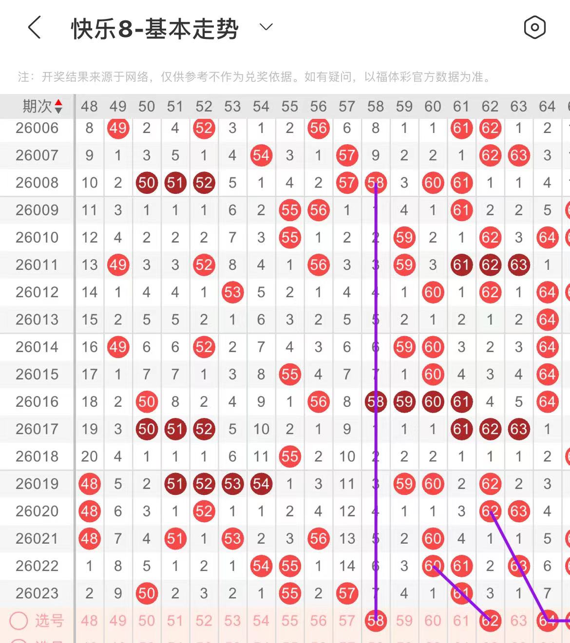 51-60区:本区间上期开出了两个号码,从号码走势图上看,该区号码走势有走冷的趋势,出号个数在一两个号码左右,有出号走势的号码有58号,隔期相同出号走势,前半区可考虑防范一码52.