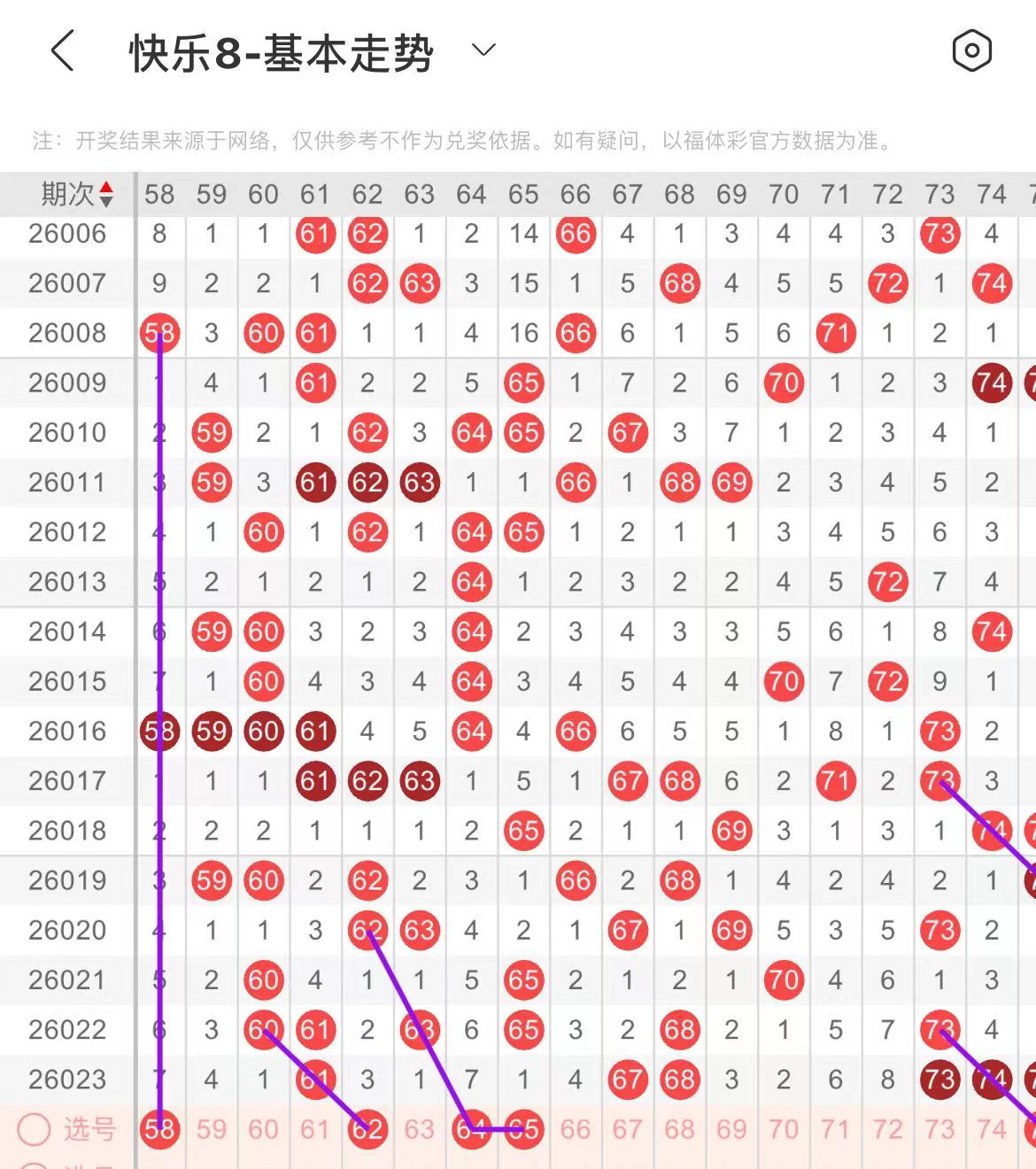 61-70区:本区间上期开出了三个号码,从号码走势图上看,该区现属于热号区,出号个数应该还能保持在三个号码左右。有出号走势的号码有62号,斜连出号走势,64号,斜连出号走势,防64.65同出。
