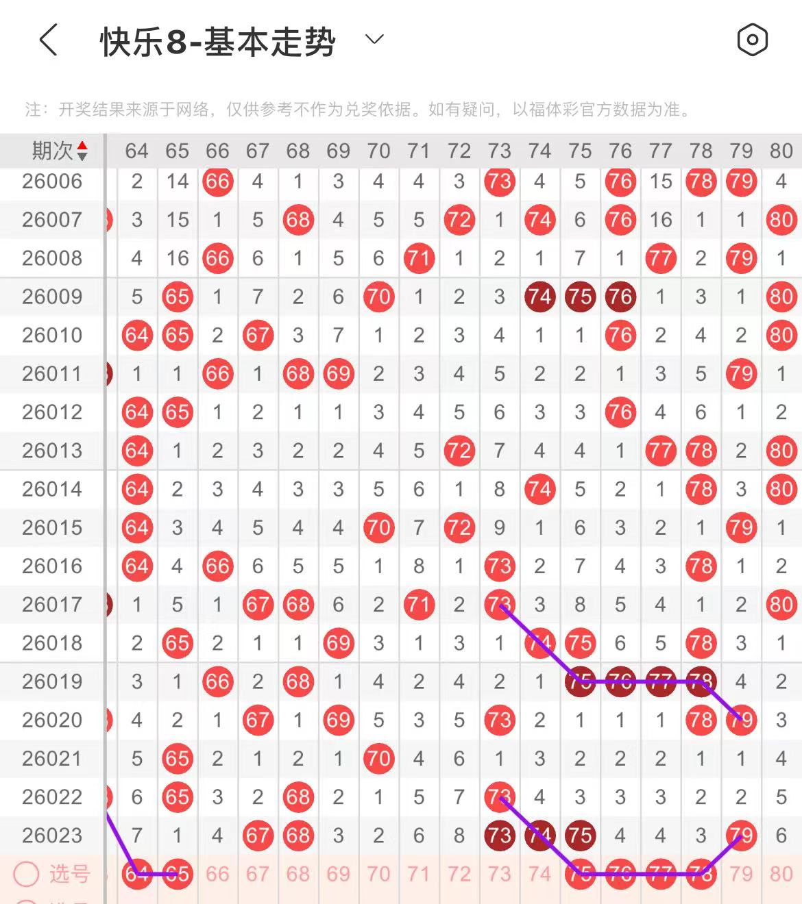 71-80区:本区间上期开出四个号码,从号码走势图上看,本期继续看好该区出号个数走高位,有连号开出的可能。本期有出号走势的号码有75.76.77.78,直接复制上面走势形态出号。