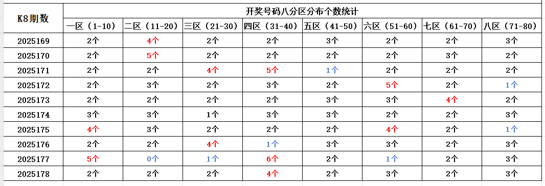 如图,红色字体是热号区,区间开出4个及以上号码。蓝色字体是冷号区,区间开出1个及以下号码。以近10期为一个分析周期,依据久热必冷,久冷必热的规律,本期重点关注:一区、四区,区间可能开出3-4个号码。二区、三区、六区、八区,区间可能开出1-2个号码。个人分析,仅供参考。