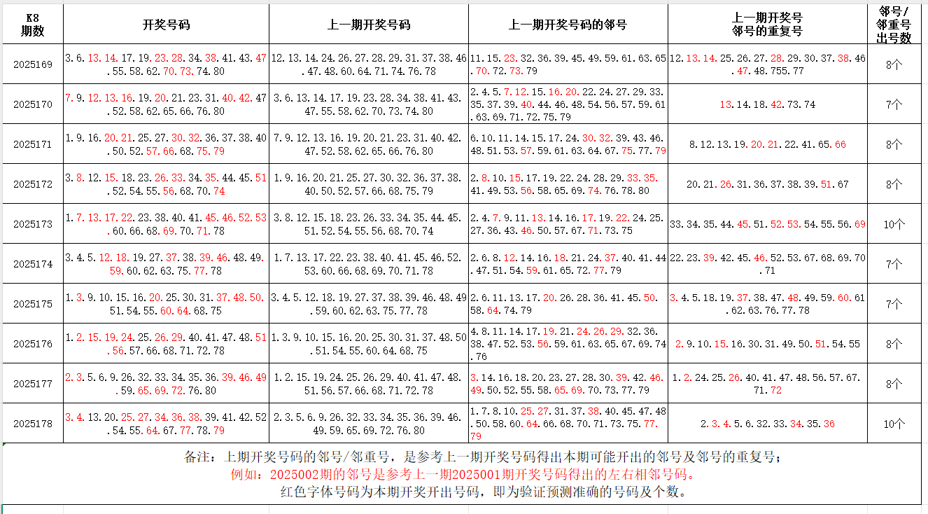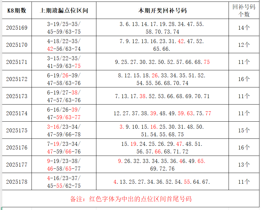如图,上期的遗漏号码在下期开出10个左右,即为回补号码。定准点位区间首尾号码是关键!以上期2025178期(会员专区数据)为例,定位4个遗漏区间,围中11码!结合上期开奖号码,以跨度值大于或等于7为依据,本期关注6个遗漏区间:4-13/13-20/27-34/42-52/55-64/67-77;重点关注遗漏-区间:****(会员专区可见),区间遗漏号码可能在本期回补开出。注意区分遗漏区间回补号码和大底号码,不要混淆。个人分析,仅供参考。