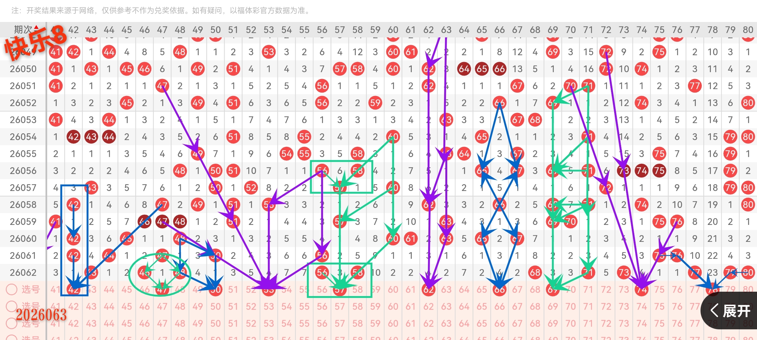 78:78是偶数。上期四区尾部开了77、79、80,78正好在77和79中间。看,又是“夹心”!短短四区,我找到两个“夹心号”,这期这个特征明显。78被两个奇数包围,它自己作为偶数出现,能平衡奇偶。而且78本身也常出,放在这个位置很合适。