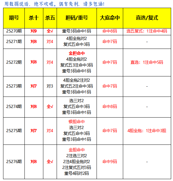 上期杀10码对9,免费文章杀5码全对,重号3码命中1码。大底推荐命中8码,本期再接再厉。