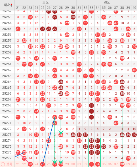 三区开出:22 奇偶比: 0:1 和值:22 跨度:0,上期开出1个号码,偶数。本期三斜连走势:23,隔码斜连走势:25,近10期平均出号1.8枚。推荐关注号码:23、25、27、28。