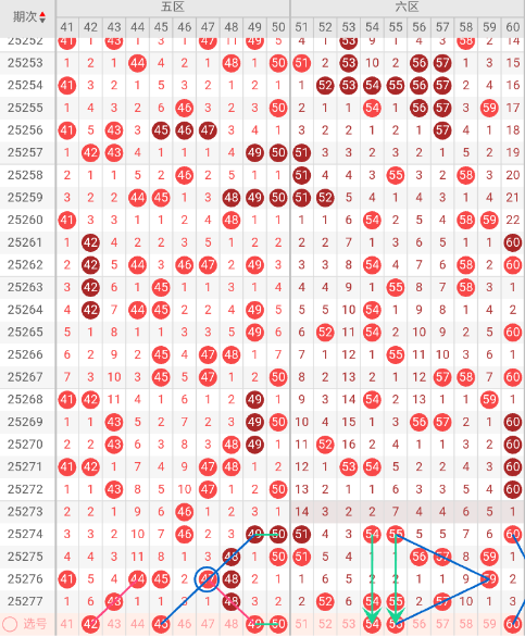 六区开出:52,54,55,57 奇偶比: 2:2 和值:218 跨度:5,上期开出4个号码,奇偶数号码均衡。本期无三斜连走势,隔码斜连走势:55 60。近10期平均出号2.5枚,本期推荐关注号码:54、55、60。