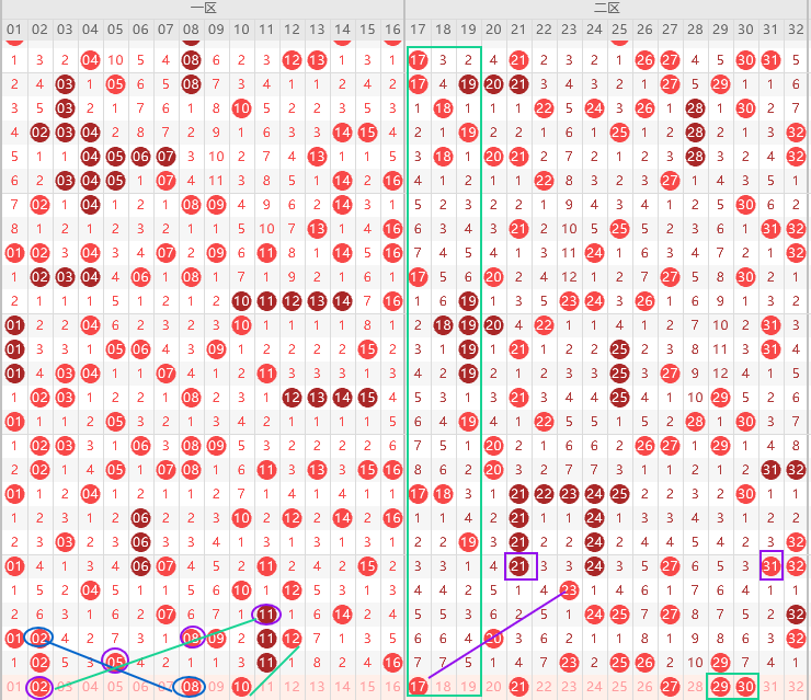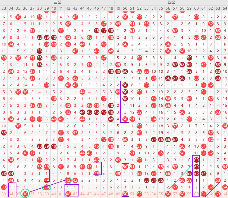 边号34 38 40出一码,边号期期出是非常稳定的短期规律,本期边号38 40二出一,重号防33,这个区比较冷,建议选4码内,遗漏值隔一期号出多期,本期只有34 42 43三出一,3尾比较热优先43,形态上36是斜连号,上图已勾画,关注五码 34 36 38 42 43,一胆43双三36 43