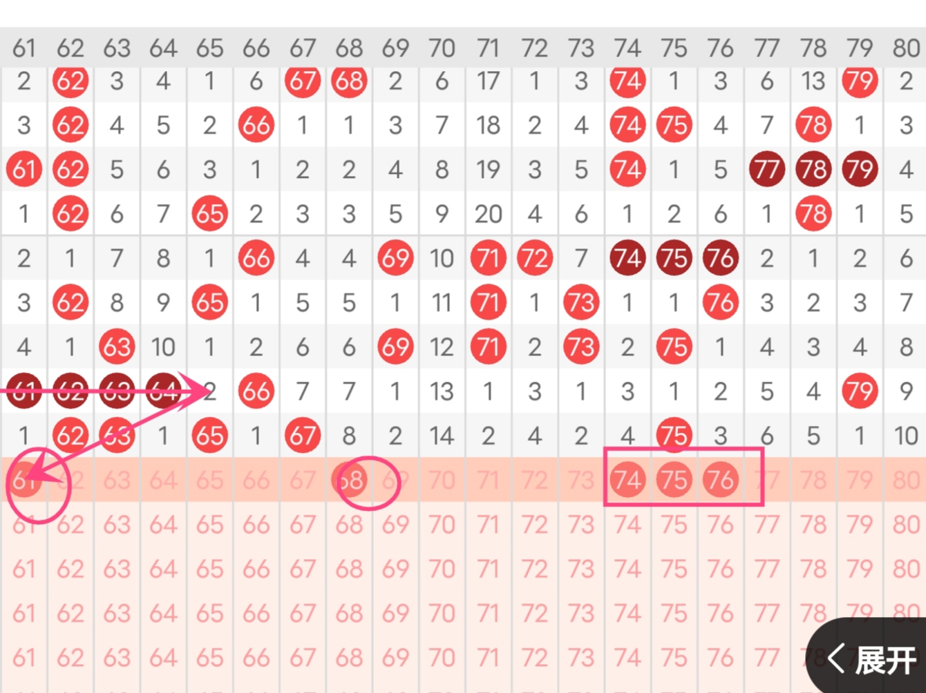四区:第四区间上期开出5码,六头前段较集中开出,本期在此范围选号较不错,七头仅回补一码75号本期考虑回补下落,六头本期61 68考虑做一码,七头中间位置考虑回补或75号坐重 四区胆码 61 75
