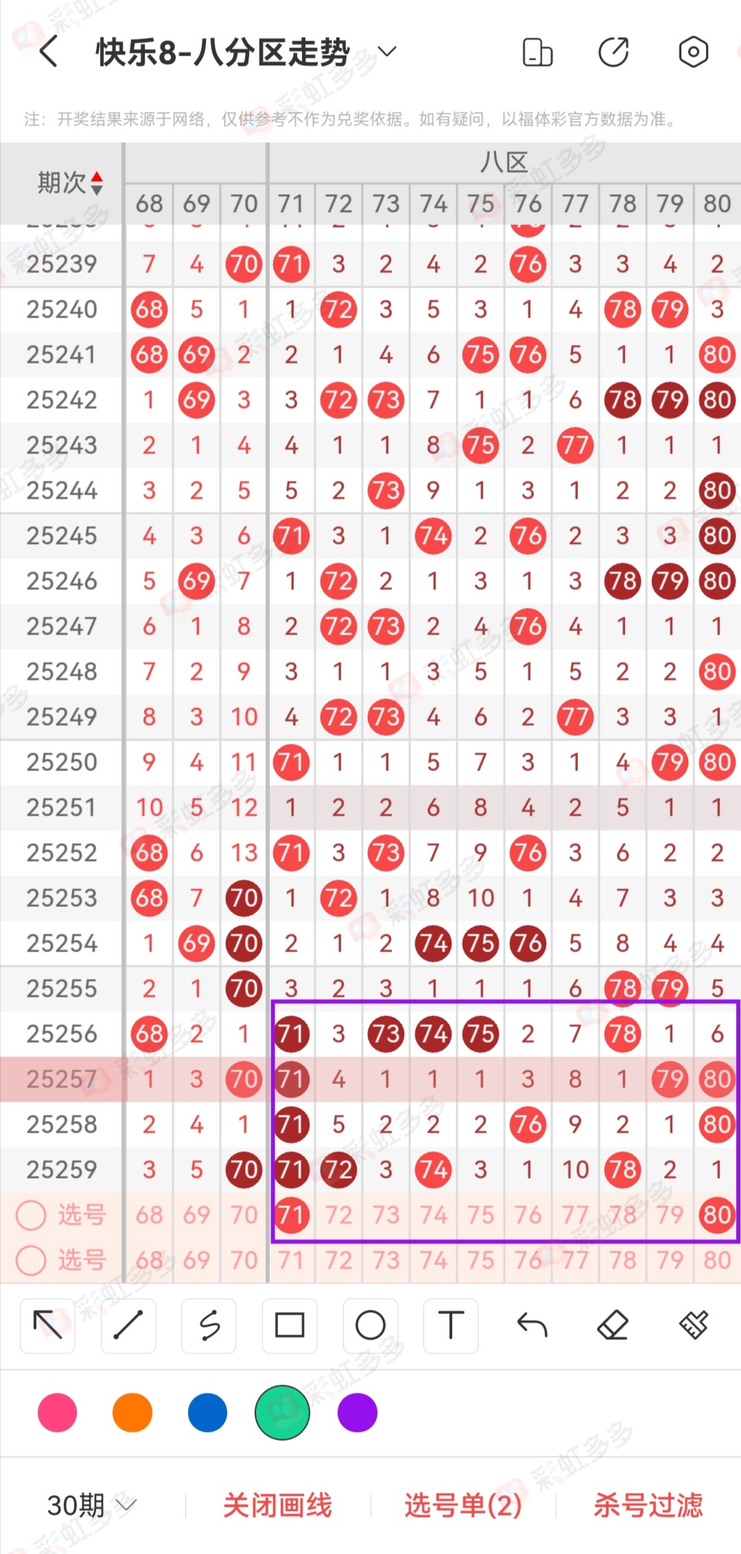 今天我们首先讲解一下基本逻辑。二出一的号码为71 80。这张图,这个规律我已经和大家说过很多次了,至少到目前为止还没有出现过偏差。在目前的20期数据里面,我们已经遇到了很多次的2出1。或者0尾1尾同区间内开出,间隔2期出1码已经遇到了好几次。这里的逻辑有点儿类似于昨天的51 55,实实在在的开出1个。所以今天的71 80大家需要选择1个。不能说哪个号码值得推荐,这里的71参考之前的30,那么就可以定位。但是需要考虑的是,之前出过现在还要出相同的吗,或者说改变一下出80也不是不行,这里可以参考一下01 10或者11 20以及最开始出现的31 40。这里的回补点位并不是单纯的说是1尾或者0尾。都有可能。要是参考近期的热度来看。80的走势更加不错,间隔1期还是有很大机会的。昨天的50就可以证明,间隔1有热态。所以这里就是今天的第一个位置的二选一。第二个地方,就在这里继续说一下,图我没有画出来,但是也是近期的高频。就是基本走势间隔1间隔2间隔3的结构。间隔2里面很容易开出来1个或者2个。数据表现在今天的0头,05 06。如果大家认为这里的号码不变,我可以推荐大家多看看05,05定位衔接遗漏9期的号码。这里之所以没有画图,其实存在一点细节变化。历史数据在这一块我记得不太清楚,实际上今天的间隔3,它其实并没有落位,只是说表现形态上面有这个样子。如果昨天的80开出来,那么我会同意这个点。看个人理解吧。