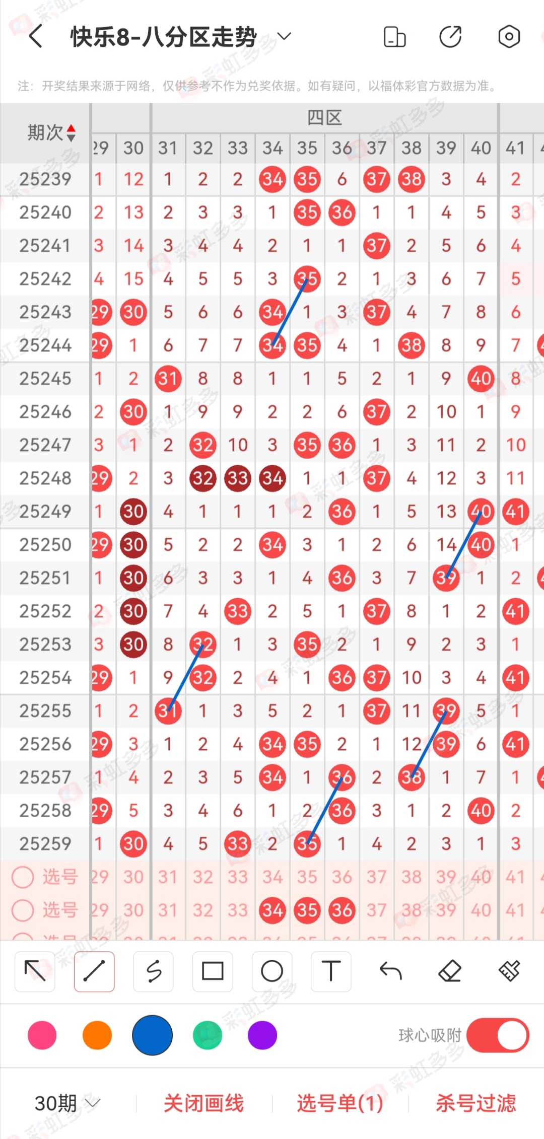 第二张图我们来讲下避坑逻辑,推荐的二选一很容易考虑,然后避坑来看看3头的点。30期数据当中存在4次走重顺位,前面3次的延续都是避坑走重且不出顺位,所以这里的逻辑就是34 35 36全部不要。只要稳定这里应该是大概率。很简单点位,现在的快乐8就应该简单想。顺其自然,但是是在做了整体避坑之后,选择简单的理解。