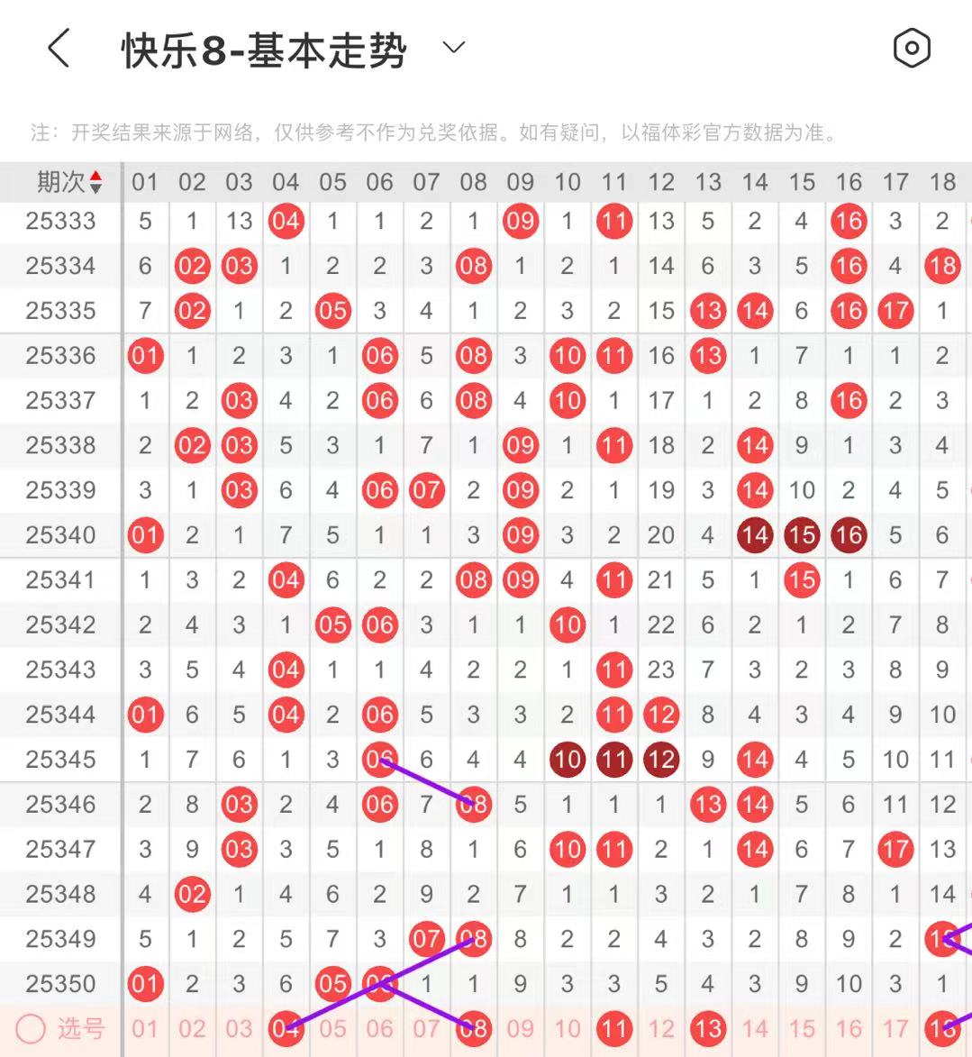 01-10区:本区间上期开出了三个号码,从号码走势图上看,该区现属于温号区,出号个数应该能保持在两个号码左右。有出号走势的号码有04号,斜连出号走势,08号,06对应08出号走势。