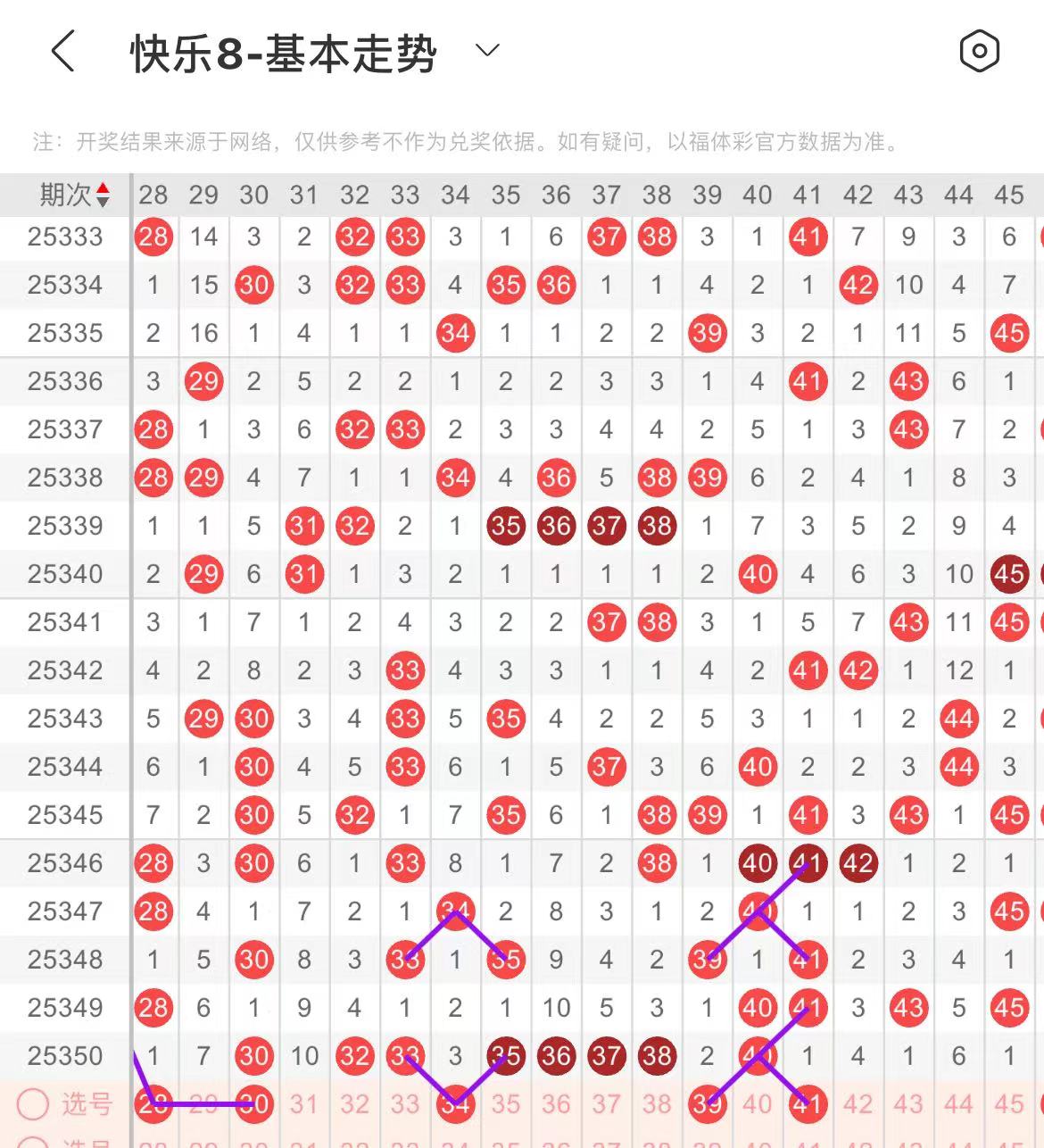31-40区:本区间上期开出了七个号码,从号码走势图上看,该区上期出号个数直接拉满,本期注意出号个数有所减少,在选号上需谨慎,有出号走势的号码有34号,为夹子号出号走势,39号,斜连出号走势。