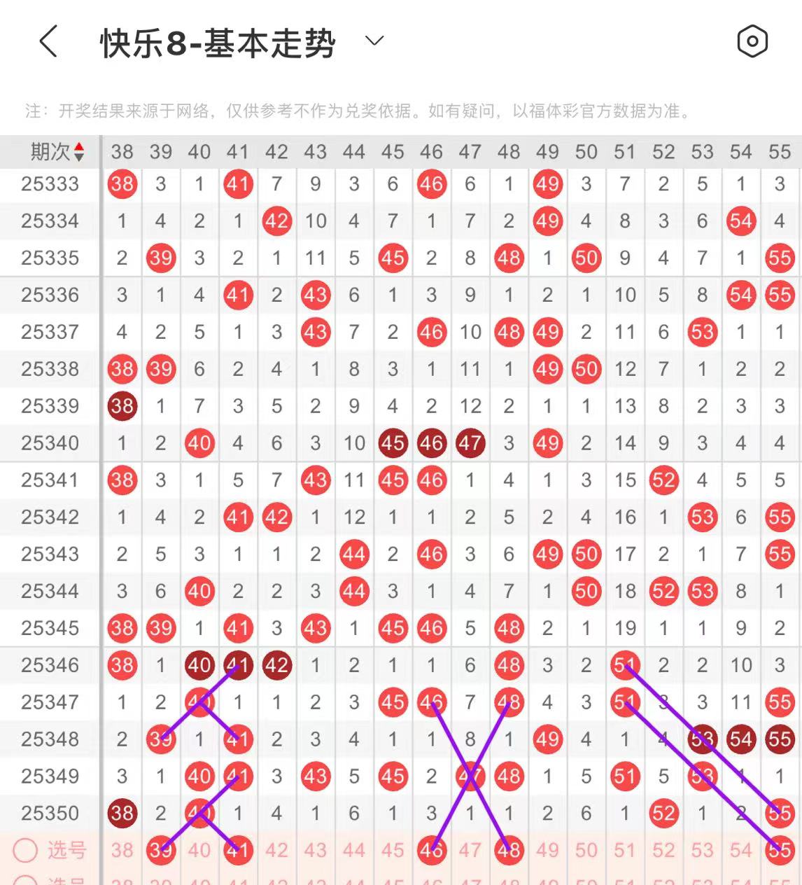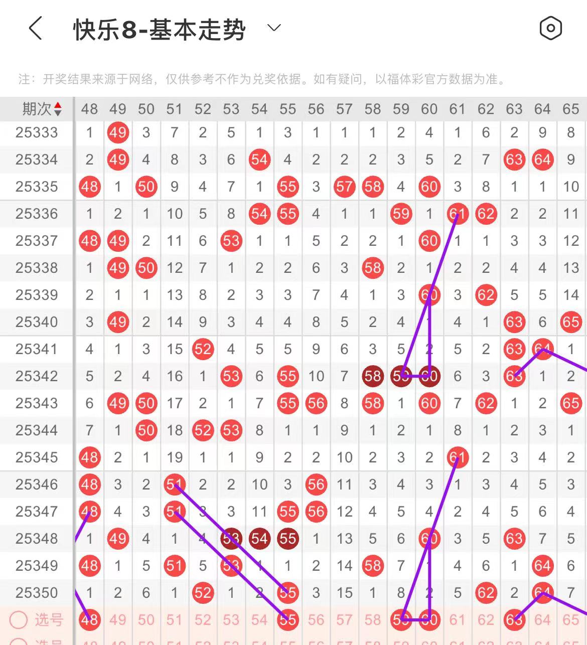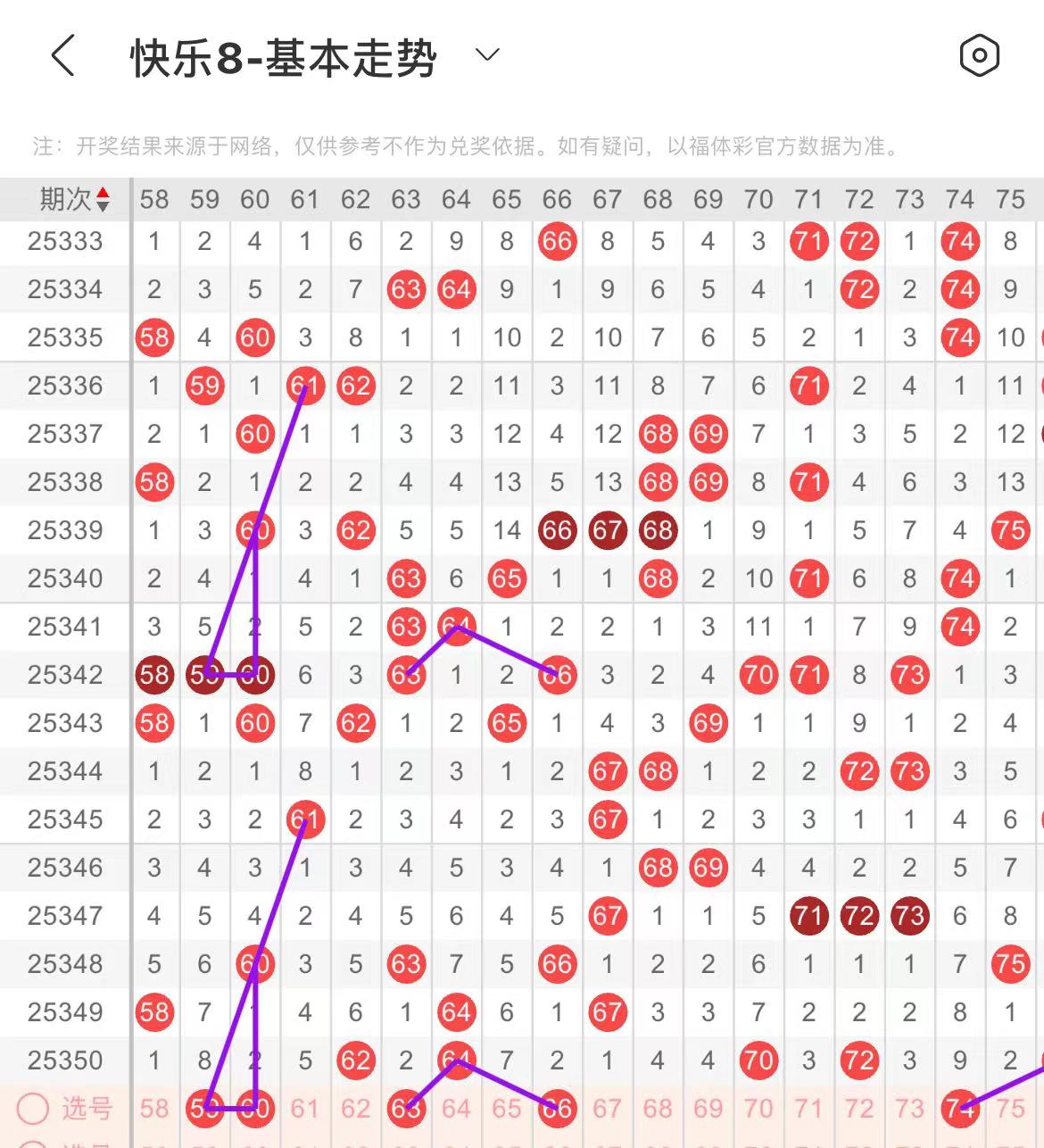 61-70区:本区间上期开出了三个号码,从号码走势图上看,该区号码走势回暖趋势明显,出号个数在两个号码左右。有出号走势的号码有63.66号,复制上面走势形态出号。