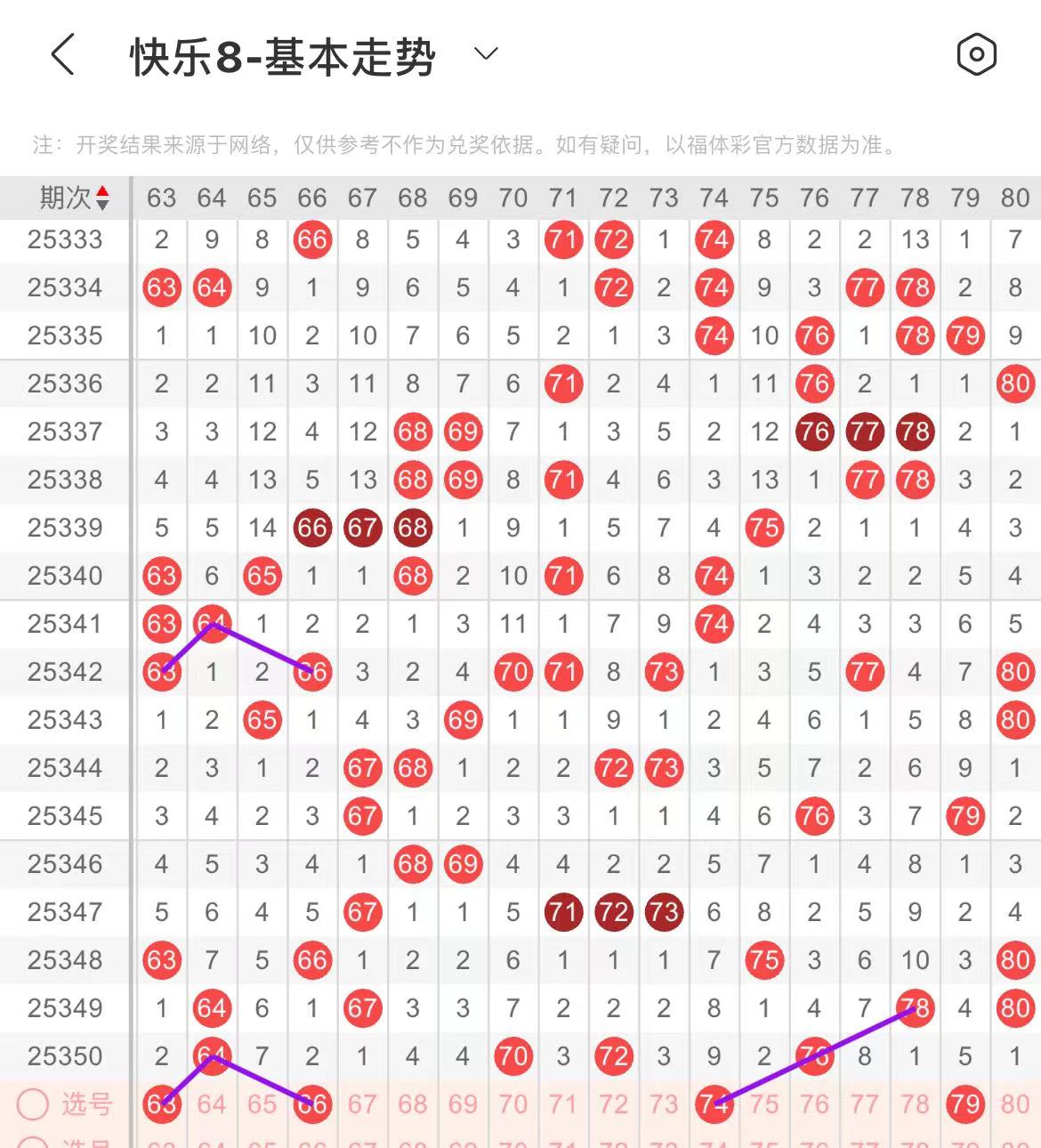 71-80区:本区间上期开出了两个号码,从号码走势图上看,该区现属于温冷区,出号个数在一两个号码左右,本期出号个数变化应该不是很大。有出号走势的号码有74号,斜连出号走势,79号,80对应79出号走势。