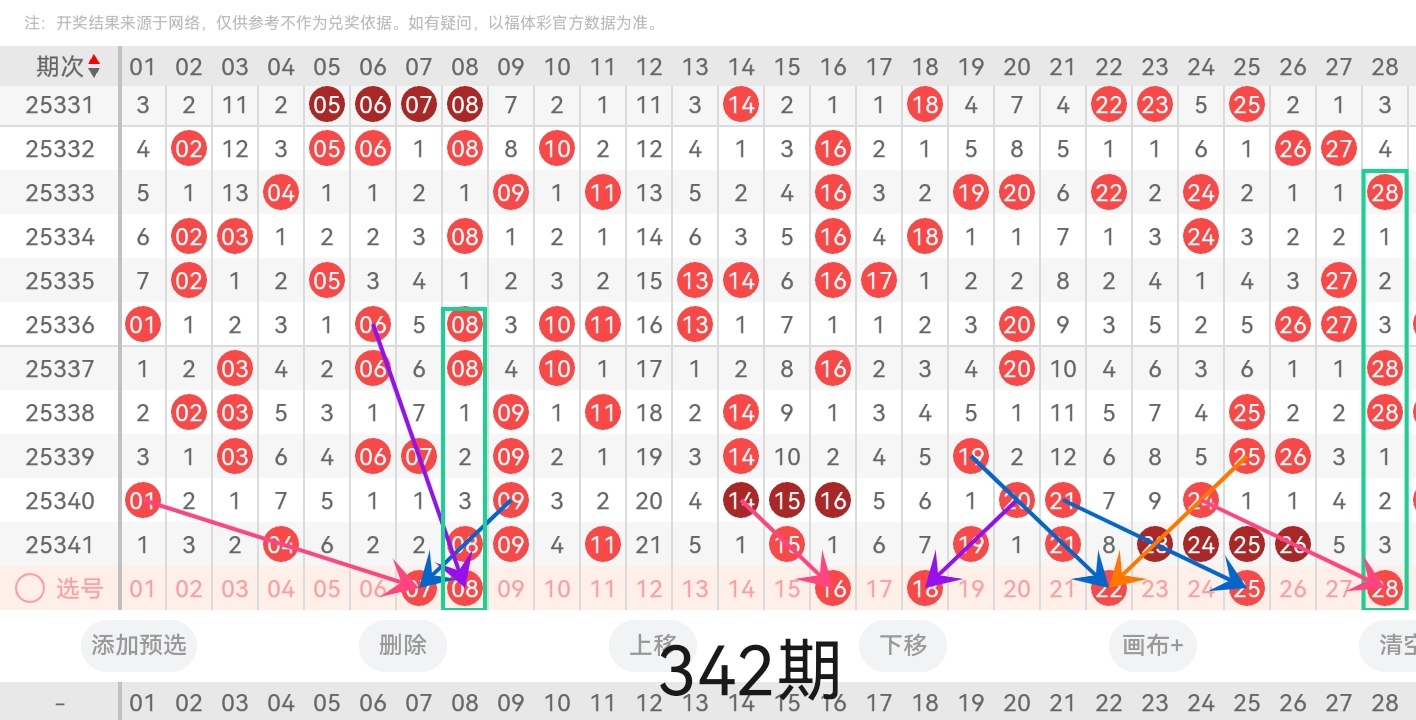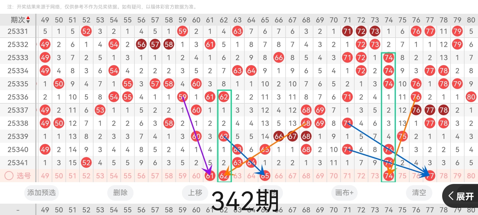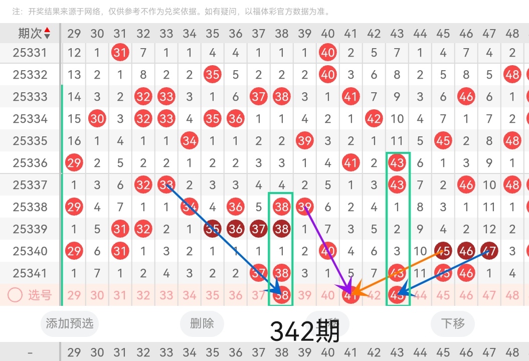 通过以上对上期的简单回顾,下面进入2025342期(下面简称本期)的选号分析:
