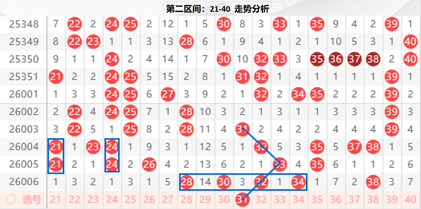 二区分析:【21-40】(走势图标注号码非小黄车大底,请谨慎参考,具体思路将在直播间分享讨论)